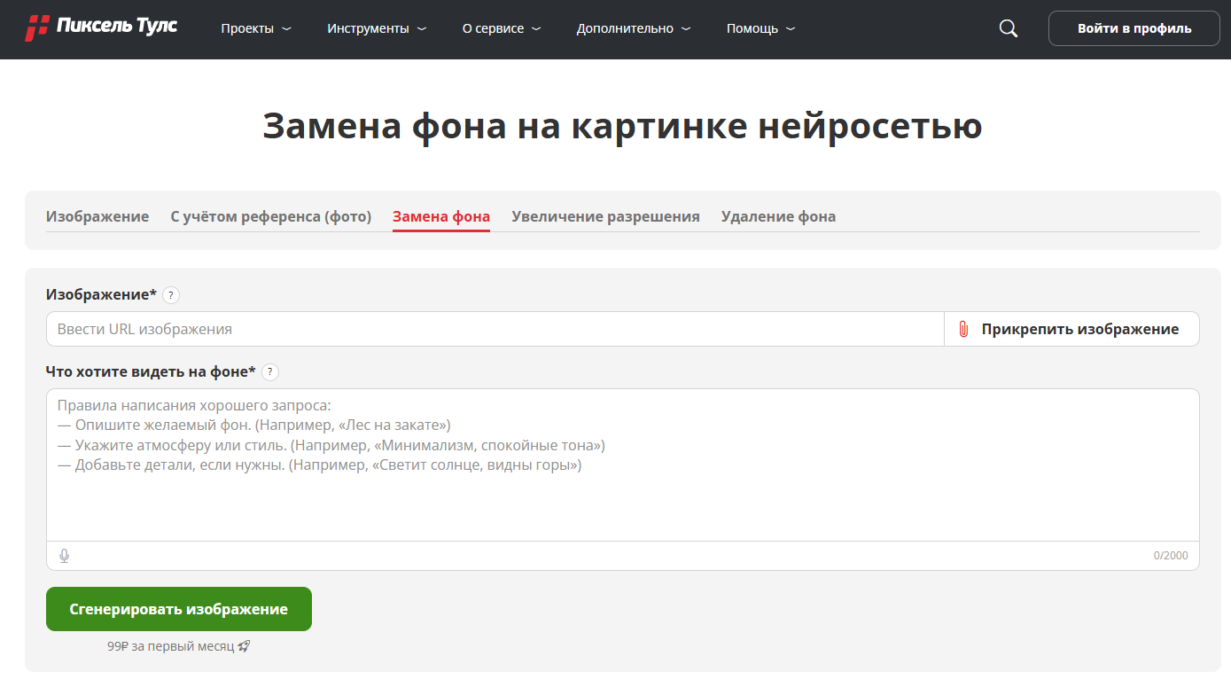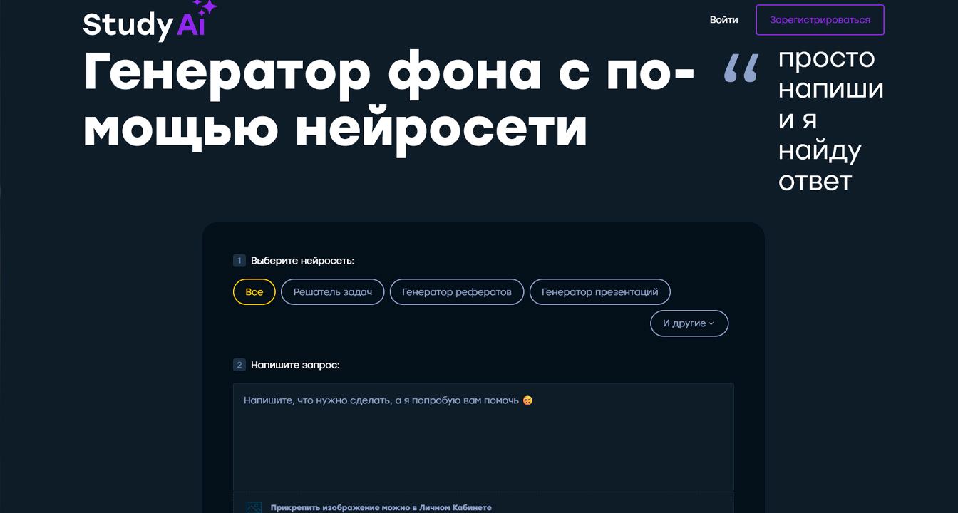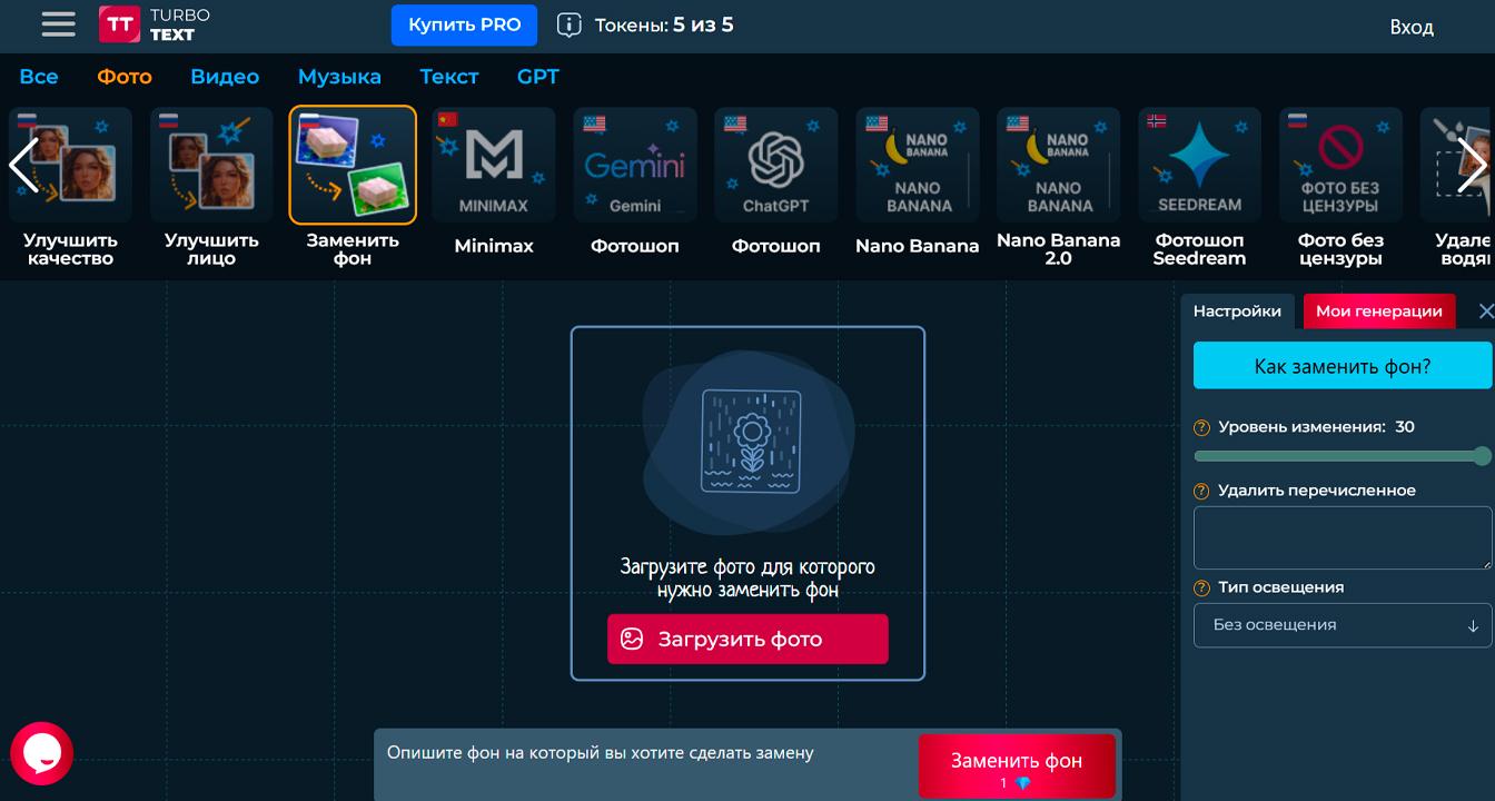 Онлайн-сервис с ИИ, который позволяет автоматически создавать новый фон для фото по описанию или загрузке изображения без использования сложных графических редакторов. Сервис работает полностью на русском языке и использует современные нейросети, включая Midjourney, Dalle-3, Claude, Gemini, DeepSeek и другие, обеспечивая качественную обработку фотографий и реалистичную подгонку фона под объект.