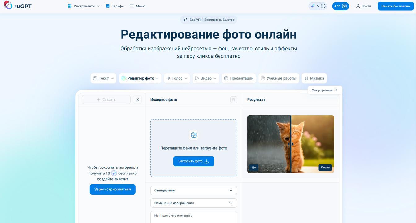 Онлайн-редактор изображений, который быстро и просто удаляет или заменяет фон на фото, улучшает качество снимков и выполняет другие базовые функции. Сервис использует нейросети для автоматического определения объекта и отделения его от фона, что делает процесс обработки быстрым и доступным даже для неопытных пользователей.