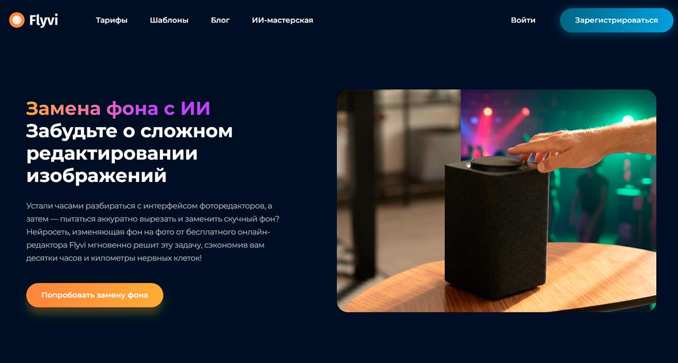 Графический онлайн-редактор с ИИ-инструментами, который работает в браузере. После загрузки и отправки изображения нейросети, вы получаете обработанное фото с высоким разрешением, готовое к публикации или печати. Flyvi позволяет легко сменить фон на любой другой, просто загрузив фото и выбрав желаемый результат, что делает его удобным решением для помощи оформления фото для маркетплейсов, соцсетей и презентаций.